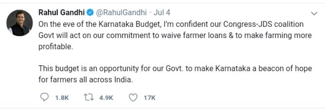 ઉલ્લેખનીય છે કે રાહુલ ગાંધીએ ખાસ ખેડૂતોના દેવા માફી પર ધ્યાન આપ્યું હતું અને સૌથી પહેલા ખેડૂતોના દેવામાફીનું વચન પાળવાનો આગ્રહ કર્ણાટક સરકાર પાસે રાખ્યો હતો. જેના સંકેતો પણ બુધવારે રાહુલ ગાંધીએ ટ્વીટર પર ટ્વીટ કરીને આપ્યા હતા.